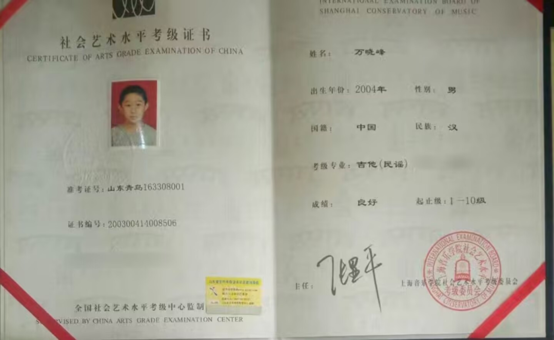 他自小学习吉他并考取了吉他十级证书,在学校中他积极组织并参加“五月的花海”合唱比赛、电影鉴赏、摄影大赛和心理情景剧表演等活动,在这些活动中学会了如何欣赏美、发现美、塑造美。