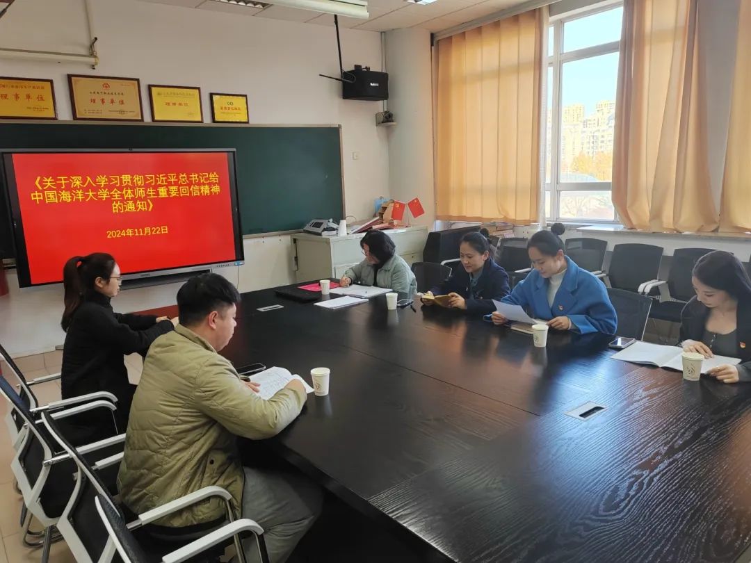 刘雅惠带领青年教师通读了习近平总书记给中国海洋大学全体师生的回信。回信强调,学校要以科技发展、国家战略需求为牵引,完善学科设置调整机制和人才培养模式,为建设教育强国做出更大的贡献。随后,教师代表结合学习工作进行发言。刘雅惠表示,青年教师应当牢记习近平总书记的嘱托,以更昂扬的奋斗姿态回应时代的热切期盼,努力学习、加强科研、投身实践,为实现中华民族伟大复兴贡献青春力量;教师代表宋艳文结合习近平总书记提出的教育强国的目标,提出需要将重要回信精神内化于心,外化于行,引导同学们坚定理想信念,树立家国情怀,注重学科交叉,将个人发展融入国家发展大局。