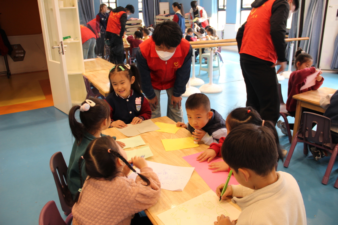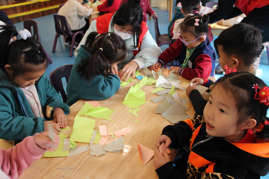 随后进入“百变折折折”环节,志愿者们手持折纸耐心地教孩子们折纸。从对折、翻转到成形,一步步示范得清清楚楚,引导孩子们自己动手尝试,孩子们学得十分认真。志愿者还启发孩子们大胆想象,鼓励他们给折好的作品添加花样,让作品更有个性。