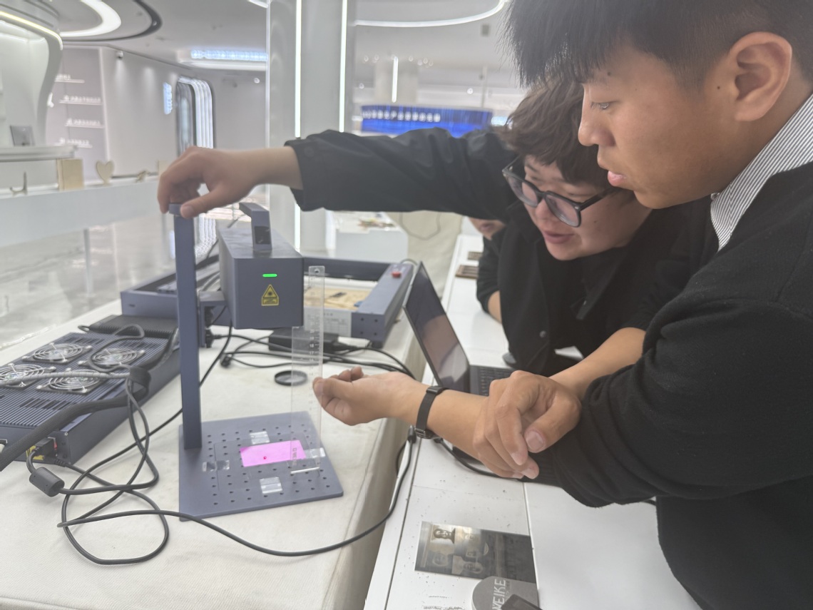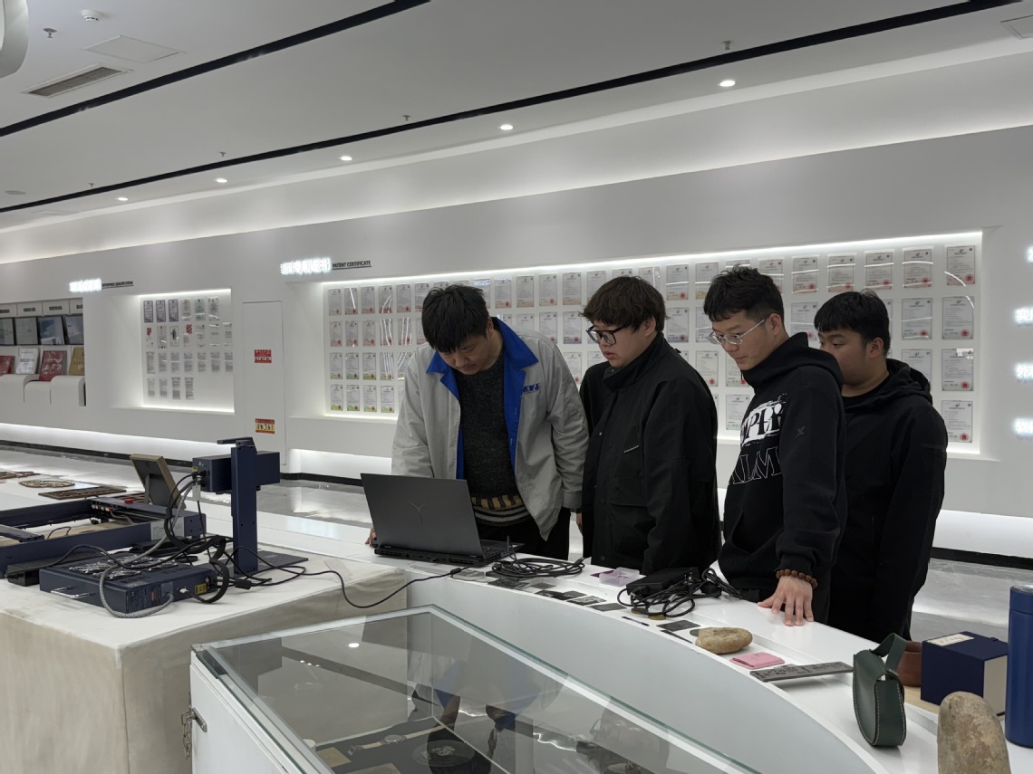 学生们在金威刻公司工作人员带领下,参观了生产车间、研发中心和产品展示区。工作人员详细讲解激光雕刻机的生产流程及激光技术的广泛应用,同学们认真聆听并积极互动。实践操作环节中,学生们分组操作激光雕刻机,在专业技术人员指导下,将创意转化为实物,解决了参数调试等难题,提升了动手和解决实际问题的能力。