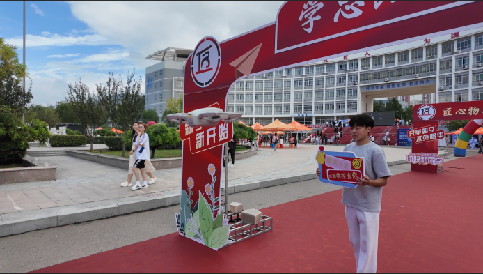 此次智能制造工程系迎新的另一大亮点是使用了喊话无人机为新生指引办理报到。“看”,一台超大无人机正悬停在空中,为新生们提供指引。它温柔的说着“亲爱的新生,请这边走,智能制造工程系欢迎您!”顿时,一股暖涌上心头,新生们不仅感受到无人机巨大的科技魅力,也感受到物控大家庭的温情。