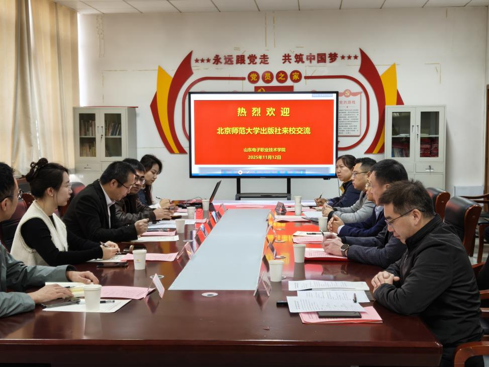 11月12日上午,我校与北京师范大学出版集团在诚意楼414会议室举行战略合作签约仪式。北京师范大学出版社职业教育分社社长庞海龙、营销与品牌推广部总经理陈俊,山东电子职业技术学院副院长李卫东,图书馆、教务处、智能制造工程系相关负责人及教师代表参加会议。