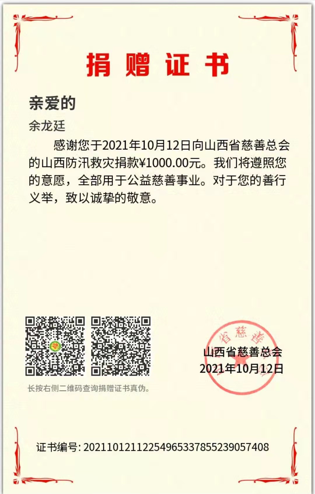 我校山西籍青年党员教师余龙廷了解到家乡受灾情况后,第一时间寻找官方捐赠渠道并向山西省慈善总会捐款1000元,用自己的实际行动践行初心,担当使命,为抗洪救灾贡献自己的一份力量。