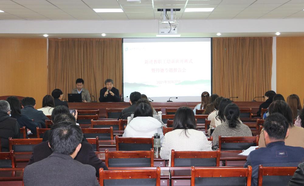 10月27日,学校举办了新进教职工培训班开班仪式暨师德专题报告会,党委副书记迟会礼作开班讲话,山东师范大学马克思主义学院任者春教授应邀作《立德树人,做一个好老师》专题报告。2021年下半年新进教职工、各系部干部、系部师德专题教育联络员参加会议。