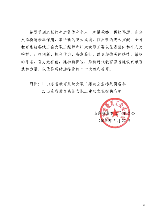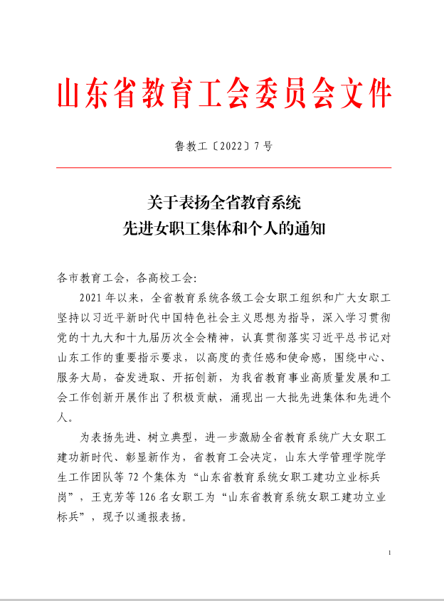 为深入学习贯彻党的十九大和十九届历次全会精神,进一步激励全省教育系统广大女职工建功新时代、彰显新作为,省教育工会评选表彰了一批全省教育系统女职工先进集体和个人,我校发展规划研究室主任李冬芸被授予“山东省教育系统女职工建功立业标兵”称号。