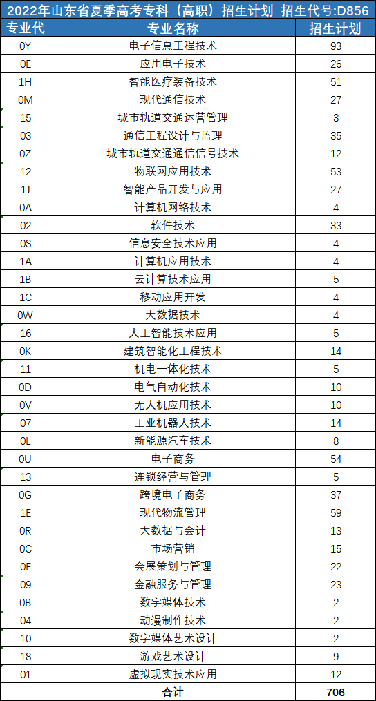 山东电子职业技术学院2022年夏季高考招生计划