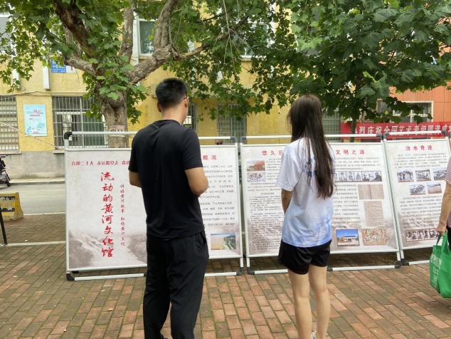 实践团成员们用通俗易懂的语言生动讲解,展示了黄河文化的强大魅力,使黄河文化、黄河精神深入人心。在宣讲现场,有位老大爷看着展板久久不愿离开,他激动的对队员说:“我曾参加过黄河抗洪,举办这次展览活动非常好,能让更多人了解黄河故事,弘扬了黄河文化!”他用自愿抗洪的亲身经历,为实践团成员上了一堂“实战”思政课,大家备感振奋、深受鼓舞。实践团成员同步制作了“流动的黄河文化馆”线上展馆,通过线上线下联动宣讲,激发了人民群众对保护黄河的热情,实践团成员们纷纷表示,将怀着对黄河文化的热爱与敬畏,继续讲好黄河故事,坚定文化自信,为黄河文化的传承和弘扬贡献出自己的青春力量。