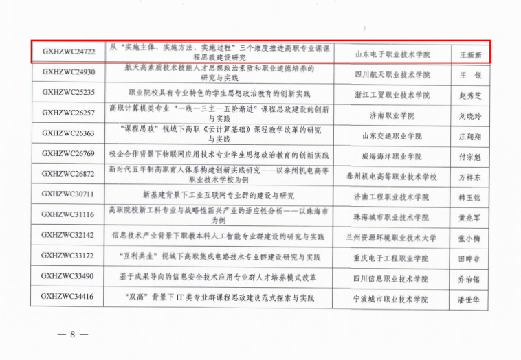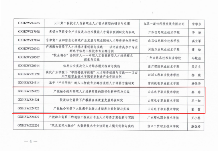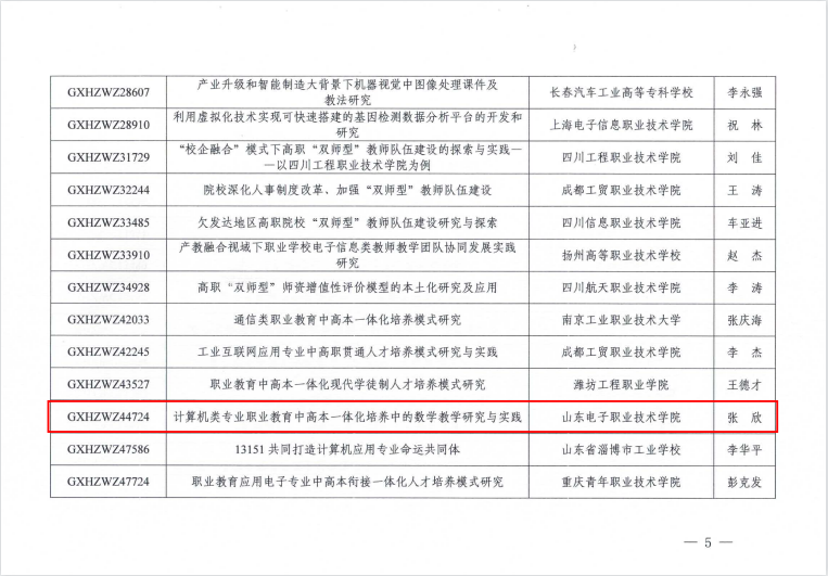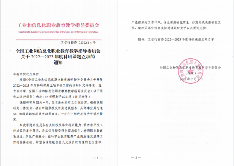 近日,全国工业和信息化职业教育教学指导委员会发布了《关于2022-2023年度科研课题立项的通知》,共立项课题187项,我校获批课题立项5项。获批立项课题为《产教融合提升高职人才培养质量的路径创新研究与实践》、《提质培优背景下产教融合高质量发展路径研究》、《产教融合背景下大数据专业群人才培养方案创新与实践》、《计算机类专业职业教育中高本一体化培养中的数学教学研究与实践》、《从“实施主体、实施方法、实施过程”三个维度推进高职专业课课程思政建设研究》。