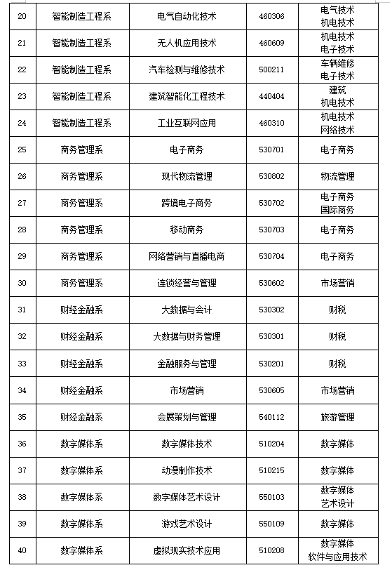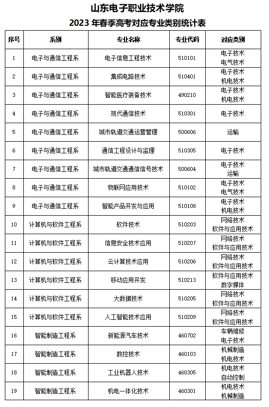 山东电子职业技术学院2023年春季高考对应专业类别统计表