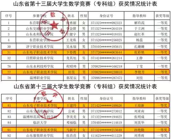 近日,第十三届山东省大学生数学竞赛总决赛落下帷幕。山东电子职业技术学院在总决赛(专科组)中获得四个一等奖,六个二等奖,创此项竞赛成绩历史新高!卞春霞、田昊、王建玲、马新宇同学荣获全省总决赛一等奖,张欣、张书玲两位老师荣获优秀指导教师奖。