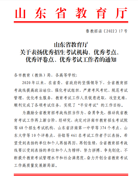 2020年以来,全省教育招生考试战线实现了“平安考试”的工作目标。为激励全省教育招考战线担当作为、奋勇争先,推动我省教育考试再上新台阶,省教育厅印发《山东省教育厅关于表扬优秀招生考试机构、优秀考点、优秀评卷点、优秀考试工作者的通知》,对近年来表现突出的考试机构、考点等进行表彰。我校获评山东省春季高考技能测试优秀考点。
