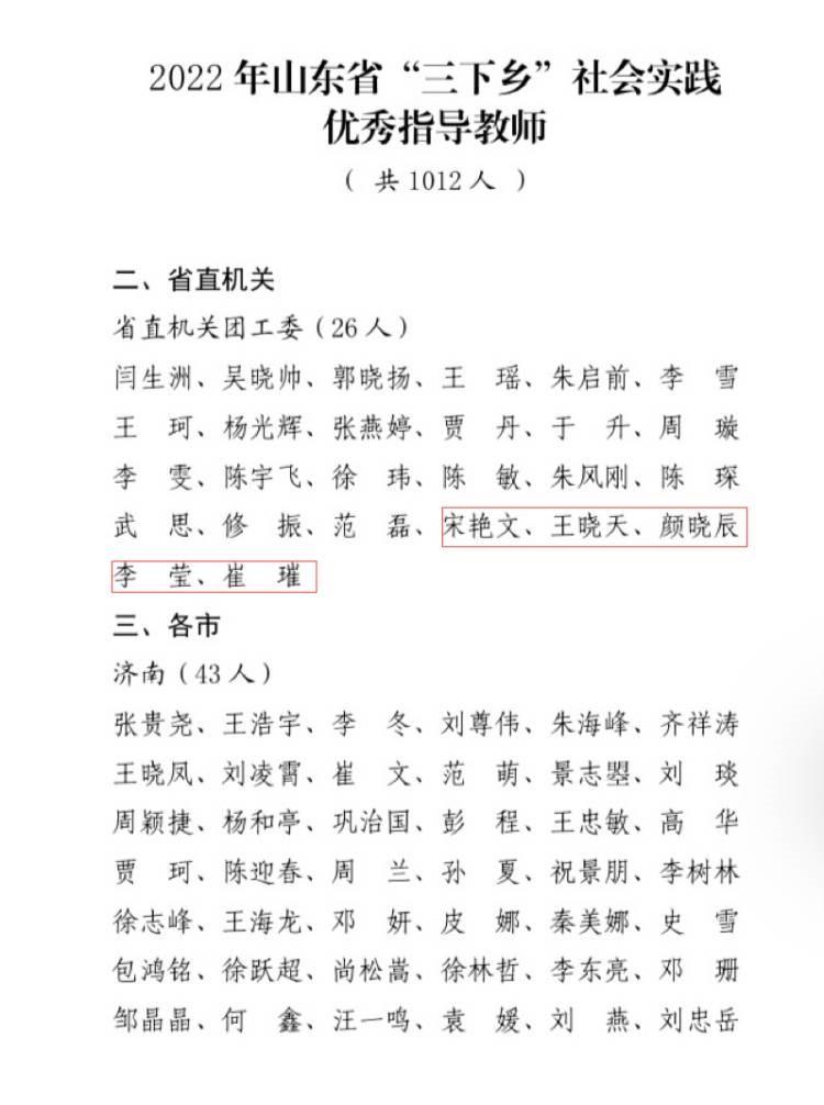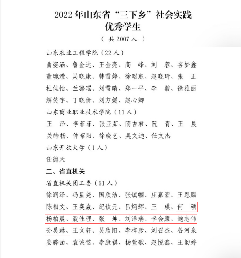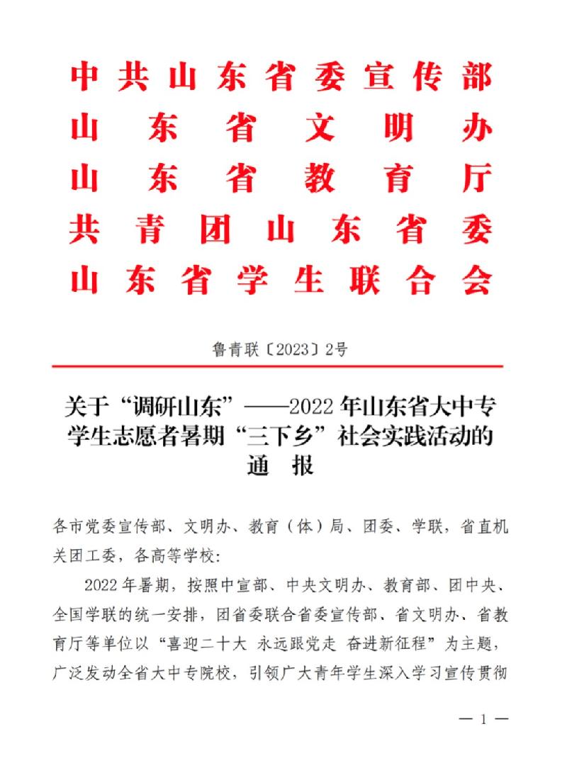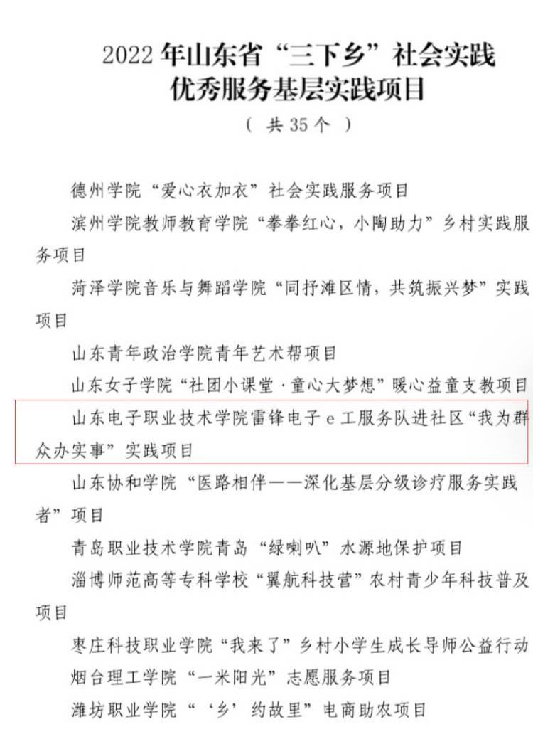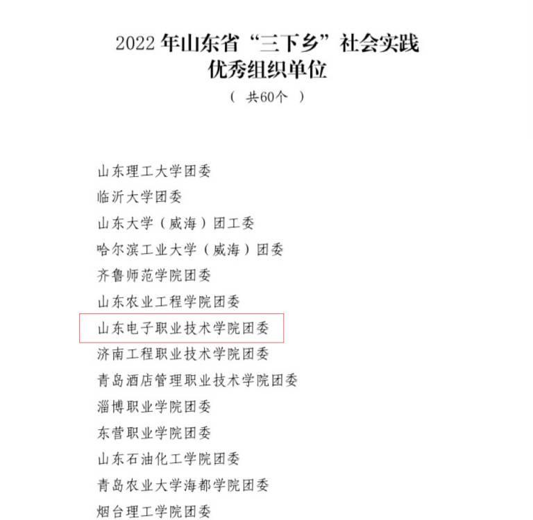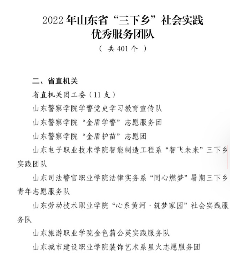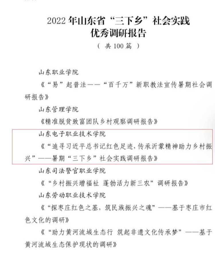 近日,在中共山东省委宣传部、山东省文明办、山东省教育厅、共青团山东省委、山东省学生联合会联合下发的《关于“调研山东”——2022年山东省大中专学生志愿者暑期 “三下乡”社会实践活动的通报》中,山东电子职业技术学院团委获“优秀组织单位”称号,崔璀、王晓天、李莹、颜晓辰、宋艳文获“优秀指导教师”称号,何硕、杨柏晨、聂佳理、张坤、刘洋瑞、李会康、鲍志伟、孙昊琳获“优秀学生”称号,智能制造工程系“智飞未来”三下乡实践团队获评“优秀服务团队”,雷锋电子e工服务队进社区“我为群众办实事”实践项目获评“优秀服务基层实践项目”,《追寻习近平总书记红色足迹,传承沂蒙精神助力乡村振兴——暑期“三下乡”社会实践调研报告》获评“优秀调研报告”。