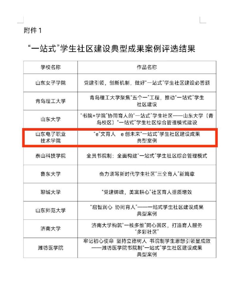 近日,山东省教育厅公布“一站式”学生社区建设典型成果案例,共评选出“一站式”学生社区建设典型成果案例10项,我校 “e”文育人 e创未来“一站式”学生社区建设成果案例成功入选。