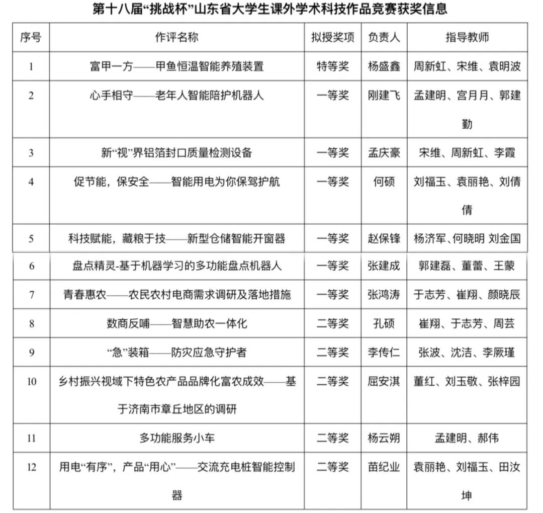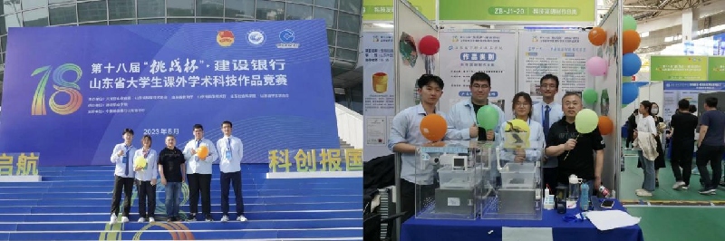 科创报国,青春启航。5月22日,第十八届“挑战杯”·建设银行山东省大学生课外学术科技作品竞赛决赛在齐鲁工业大学(山东省科学院)落下帷幕。我校推荐作品获特等奖1项、一等奖6项、二等奖5项,学校荣获“优胜杯”、“优秀组织奖”。