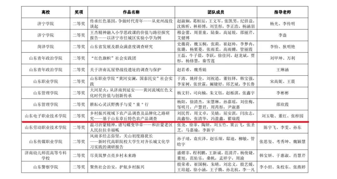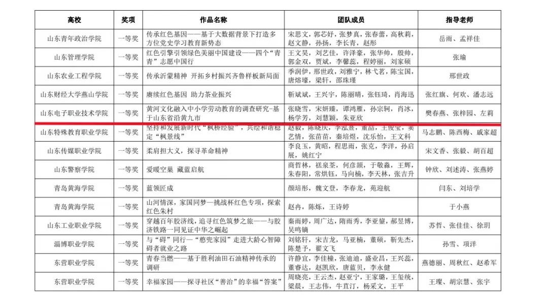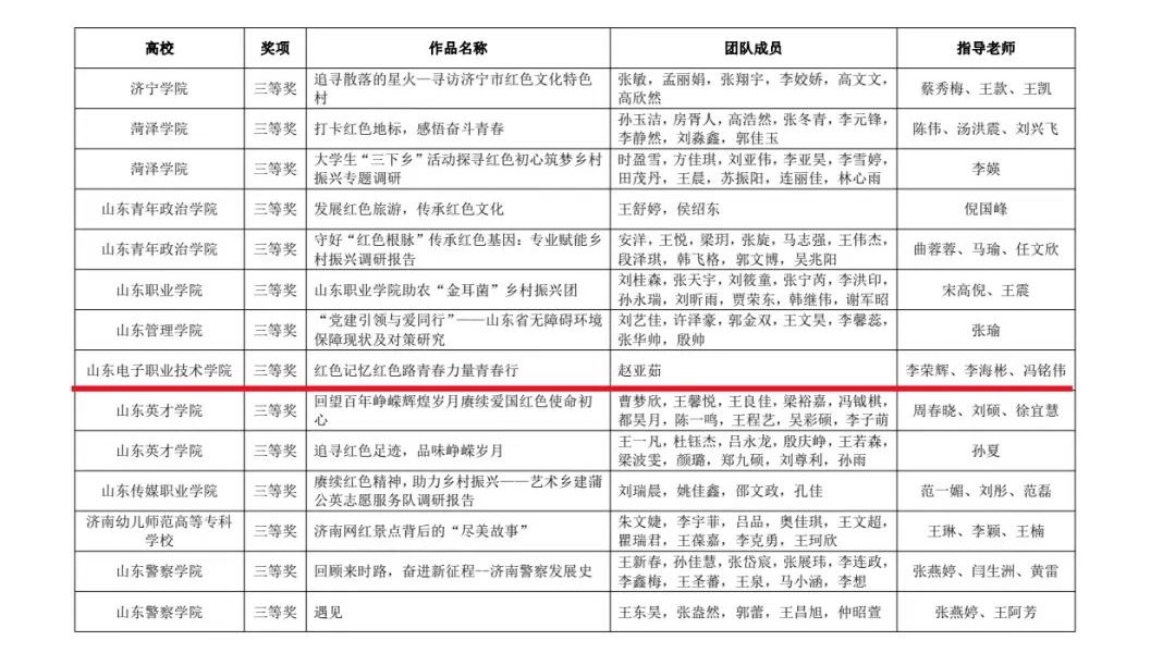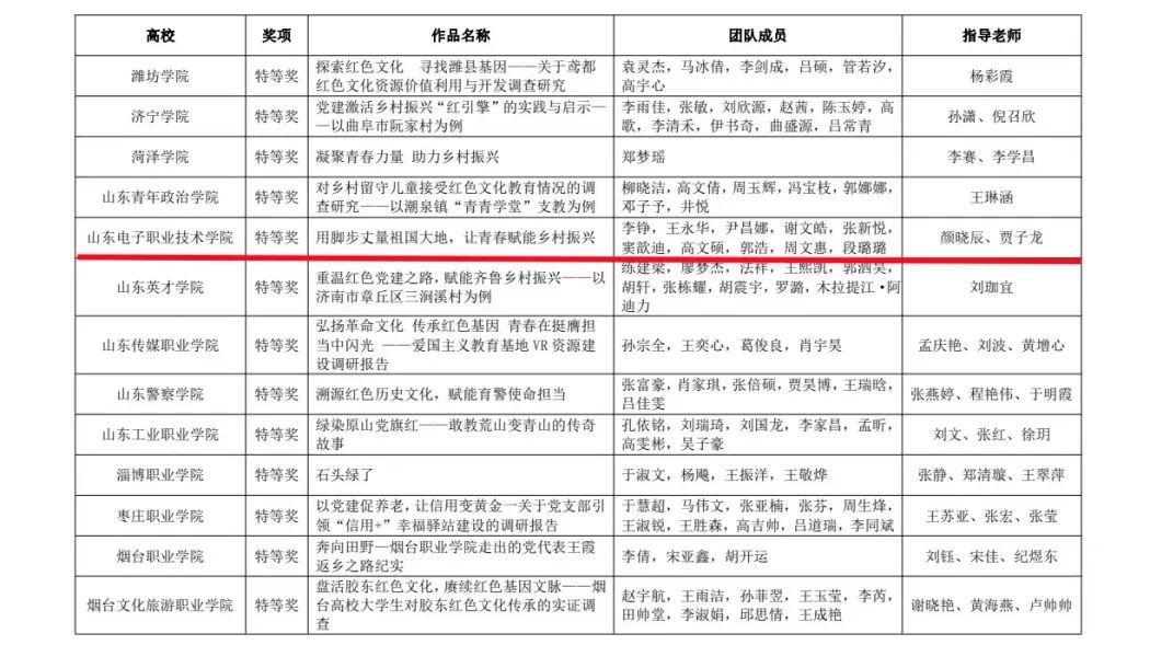 11月17日,第十八届“挑战杯”山东省大学生课外学术科技作品竞赛红色专项获奖情况公布。全省一共有320 件优秀作品在本届挑战杯红色专项赛中获奖,我校有4件作品名列其中,包括特等奖1项,一等奖1项,二等奖1项,三等奖1项,获奖成绩在全省高职院校中名列前茅。学校继本届挑战杯省赛主体赛荣获“优胜杯”、“优秀组织奖”之后再创佳绩。