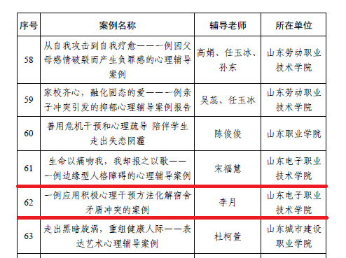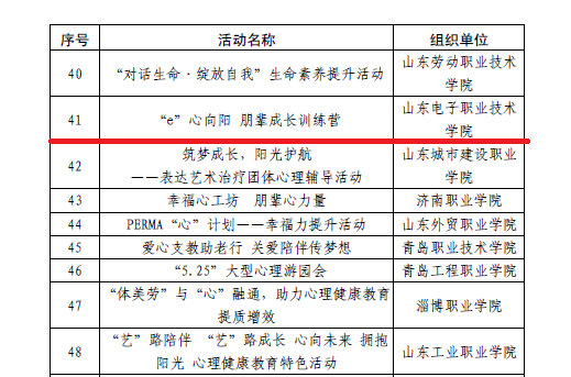 为深化全省学校心理健康教育提升行动,进一步提升学生心理健康素养,山东省教育厅于今年5月份在全省大中小学组织开展“山东省学校心理健康教育月”活动。活动期间,我校高度重视、广泛发动,打造“e心向阳”特色心理育人品牌,开展了一系列丰富多彩的心理健康宣传教育、咨询辅导、疏压解困等系列活动。学生工作处心理健康中心申报的“e心向阳 朋辈成长训练营”被评为“全省学校心理健康教育月特色活动”,学生工作处宋福慧和财经金融系李月两位老师的“生命以痛吻我,我却报之以歌——一例边缘型人格障碍的心理辅导案例”、“一例应用积极心理干预方法化解宿舍矛盾冲突的案例”被评为“全省学校心理健康教育月心理辅导干预典型案例”。