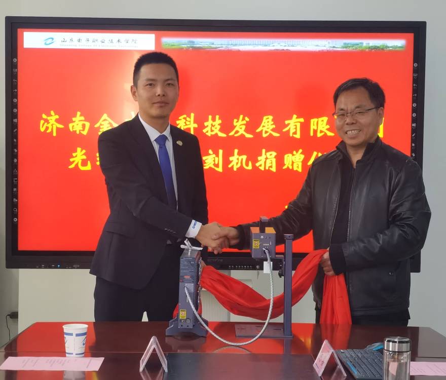 11月20日下午,济南金威刻激光科技股份有限公司光纤激光雕刻机捐赠仪式在我校举行。济南金威刻激光科技股份有限公司副总经理寇增君、营销总经理游福德、人事经理张昕、云激光主管蒋天磊出席活动,院长张建臣出席活动并发表讲话。