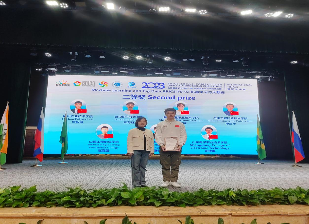 2023年11月6日—10日,金砖国家职业技能大赛国际赛在广安职业技术学院举办,来自金砖国家共87支代表队参加决赛,我校计算机与软件工程系大数据技术专业2022级学生刘佳祺作为山东省代表队参加大赛,喜获二等奖,指导教师郭建磊荣获优秀指导专家。