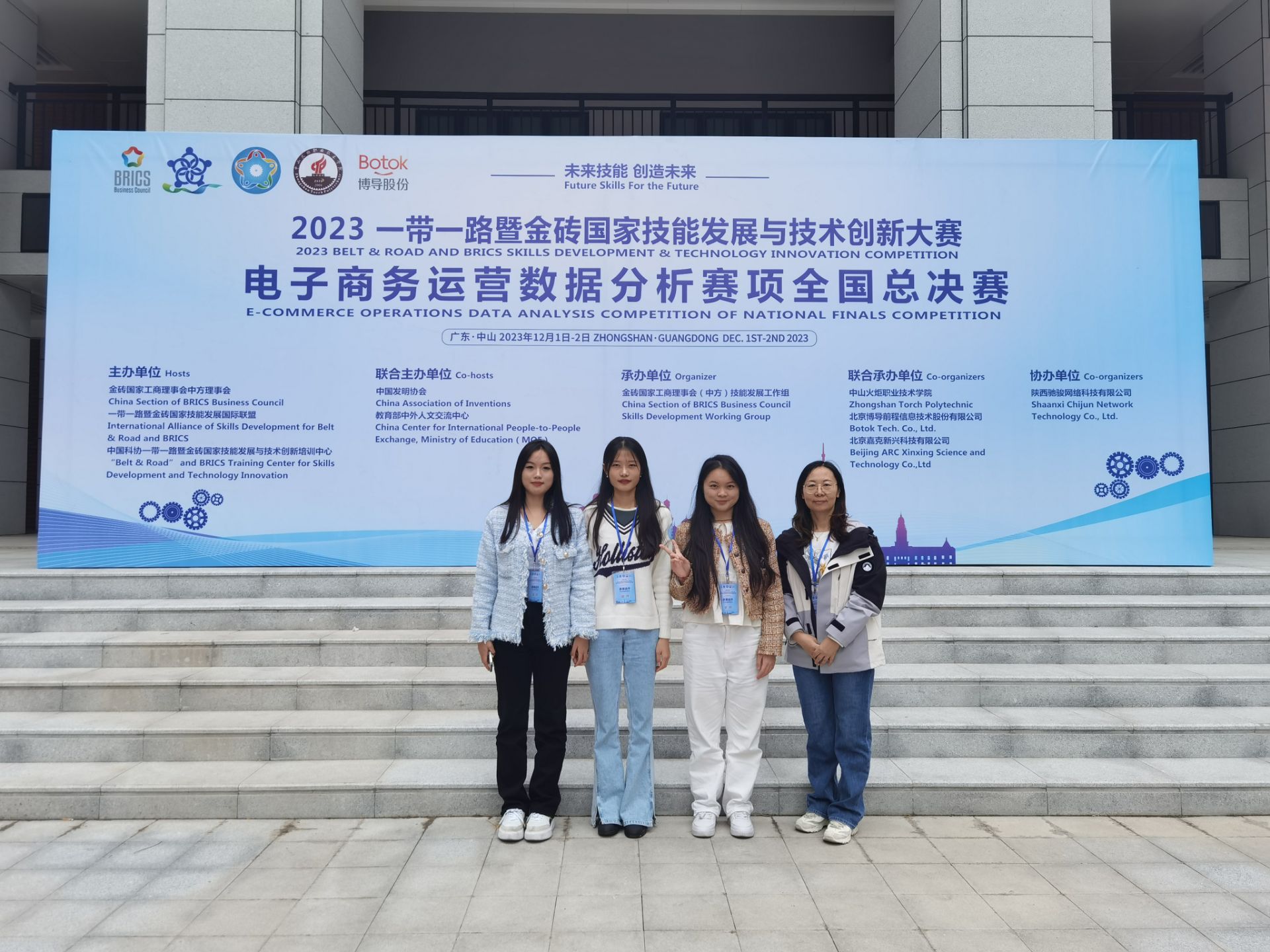 2023年12月2日,由金砖国家工商理事会中方理事会等单位联合主办的2023一带一路暨金砖国家技能发展与技术创新大赛电子商务运营数据分析赛项全国总决赛在中山火炬职业技术学院举行,来自全国77所院校的中职、高职、本科共计85支队伍参加总决赛,我校商务管理系电子商务专业赵月、曹雪霞、苑一丹三位同学获二等奖,刘春艳、王瑞军获得优秀指导教师奖,我校也被授予优秀组织奖。