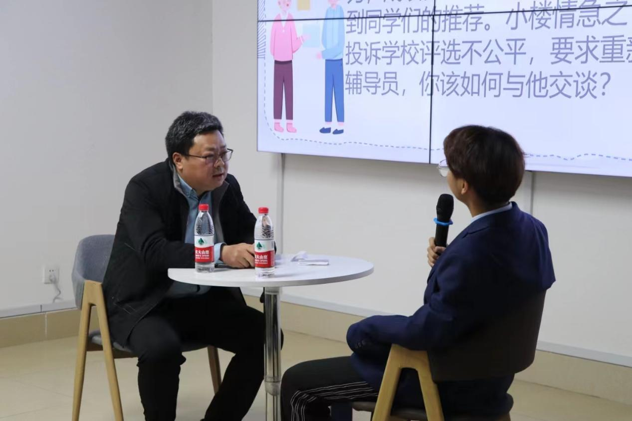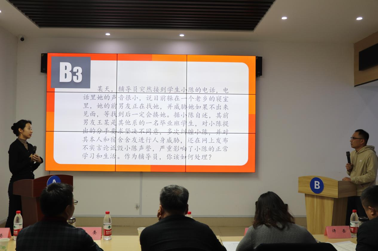 案例分析环节,辅导员们两两一组,分A、B角色,结合给出的案例,采用“我提问,你回答”的方式,既考察提问者研判问题的能力,又考察回答者解决问题的能力。在一轮轮的交锋中,选手们围绕案例,综合运用教育学原理提取关键信息、辨析原因、研讨对策、总结规律,从理论原点出发,解决实际问题,真正体现了“从理论中来,到实际中去”。