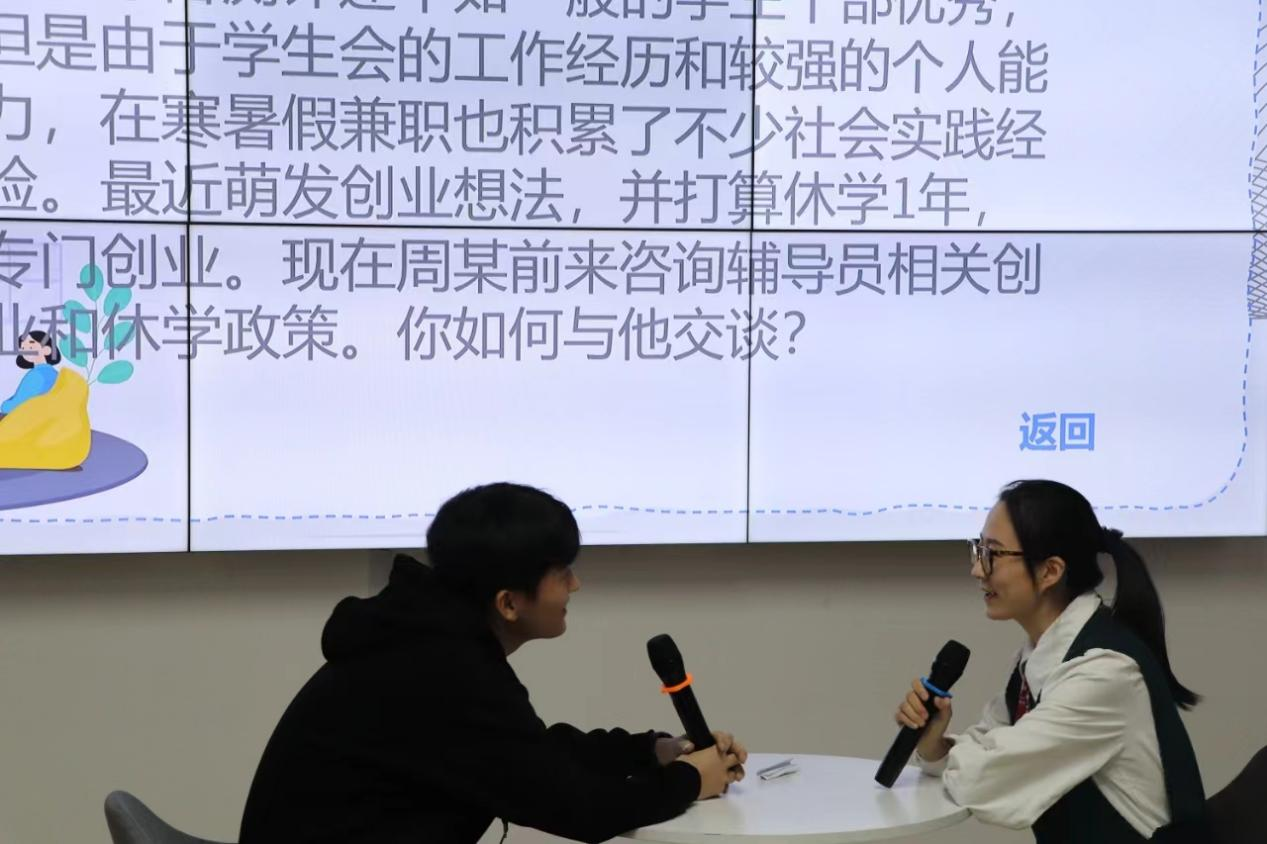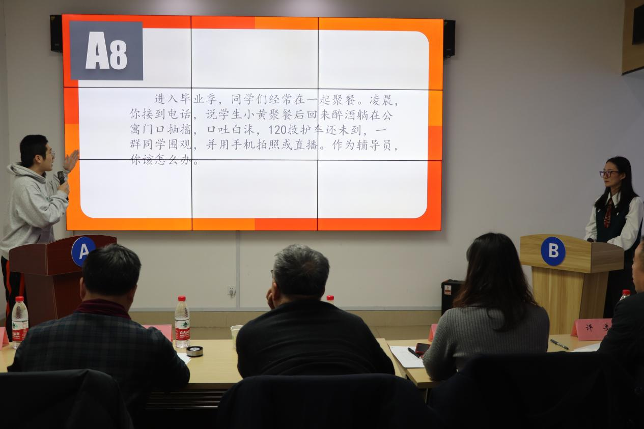 本届辅导员素质能力大赛在对标省赛赛制基础上,根据学校实际情况,分为初赛和决赛两个阶段。初赛包括基础知识测试、学情熟知、主题班会;决赛包括理论宣讲、案例分析、谈心谈话。激烈角逐中,辅导员老师们展现出了较强的业务素养和综合能力。