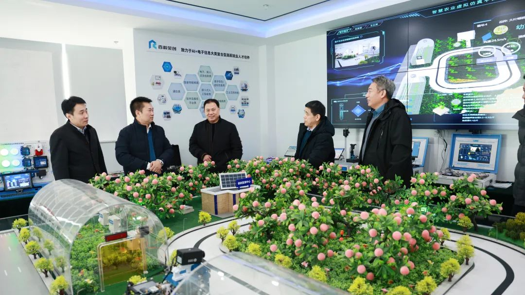 张建臣一行首先参观了百科荣创产教融合服务基地,并对基地的未来发展规划和技术创新成果给予了高度评价。随后,在百科荣创(山东)科技发展有限公司总经理张明伯的陪同下,双方就产教融合的重要性以及未来的合作机会进行了深入的交流和探讨。