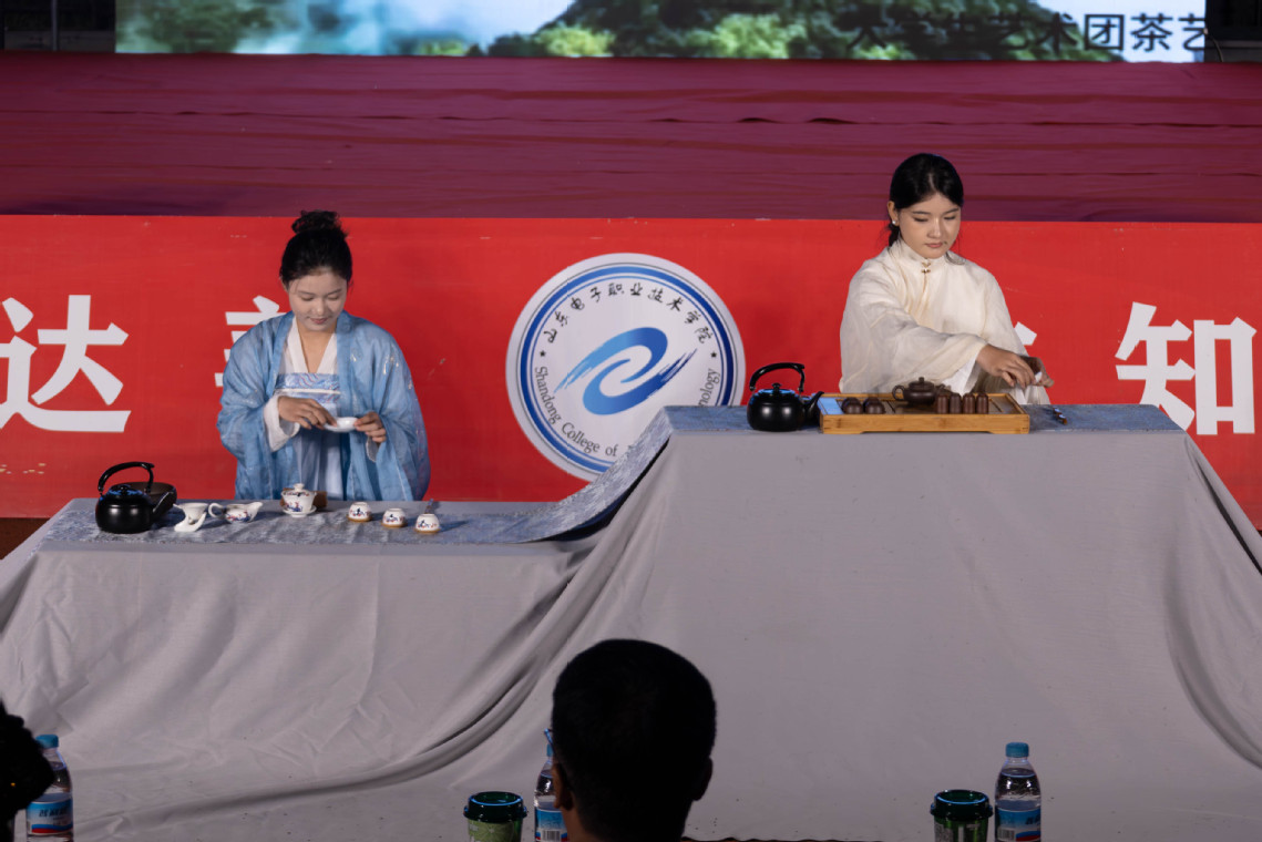 大学生艺术团茶艺表演队表演的《高山流水》中,茶香与乐韵交织,为现场勾勒出雅致的文化意境。