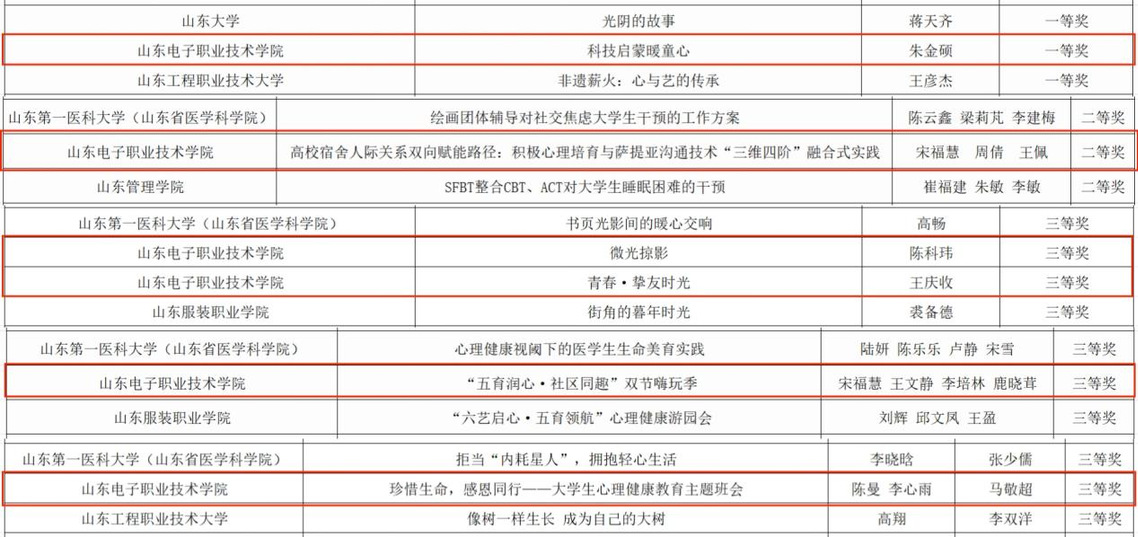 在本次活动中,电子与通信工程系朱金硕同学的摄影作品《科技启蒙暖童心》获一等奖;学生工作处宋福慧等老师提交的案例《高校宿舍人际关系双向赋能路径:积极心理培育与萨提亚沟通技术融合式实践》获二等奖;计算机与软件工程系陈科玮同学的摄影作品《微光掠影》、数字媒体系王庆收同学的摄影作品《青春·挚友时光》以及财经金融系陈曼等同学的主题班会《珍惜生命,感恩同行》获评三等奖;我校申报的特色活动《“五育润心·社区同趣”双节嗨玩季》获得三等奖。