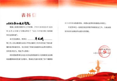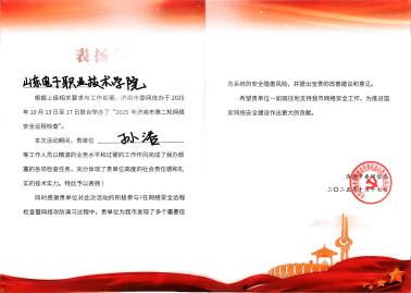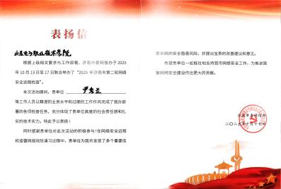 2025 年 9 月,我校入选济南市委网信办遴选的 “济南市网络和数据安全技术支撑单位”。10 月,学校承接济南市委网信办组织的 “2025 年济南市第二轮网络安全远程检查” 技术支撑任务,由网络工程系尹秀兰、车长明老师带领孙浩等学生组成团队,圆满完成工作并获市委网信办高度认可与表扬,这是我校深入推进 “产教融合” 战略的生动实践。