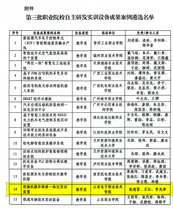 近日,中国职业技术教育学会公布第三批职业院校自主研发实训设备优秀成果案例遴选结果,共评选出106项优秀案例。我校智能制造工程系张建雷老师主持开发的“挖掘机操作维修一体化实训装置”成功入选。