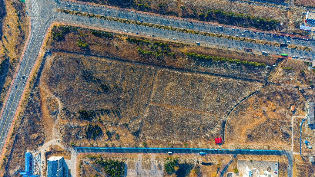 2025年,学校办公会审议通过《西外环荒地杂树去除及土地平整方案》,陆续完成了杂树清除、树枝树根清理、土地平整及绿化垃圾掩埋等基础工作。依托此处的天然地形,总务处共改造了5.65万平方米荒地,保留并平整了北侧六块种植田和南侧十级梯田,形成“田山相映”的独特景观格局,实现了土地资源的高效再利用。